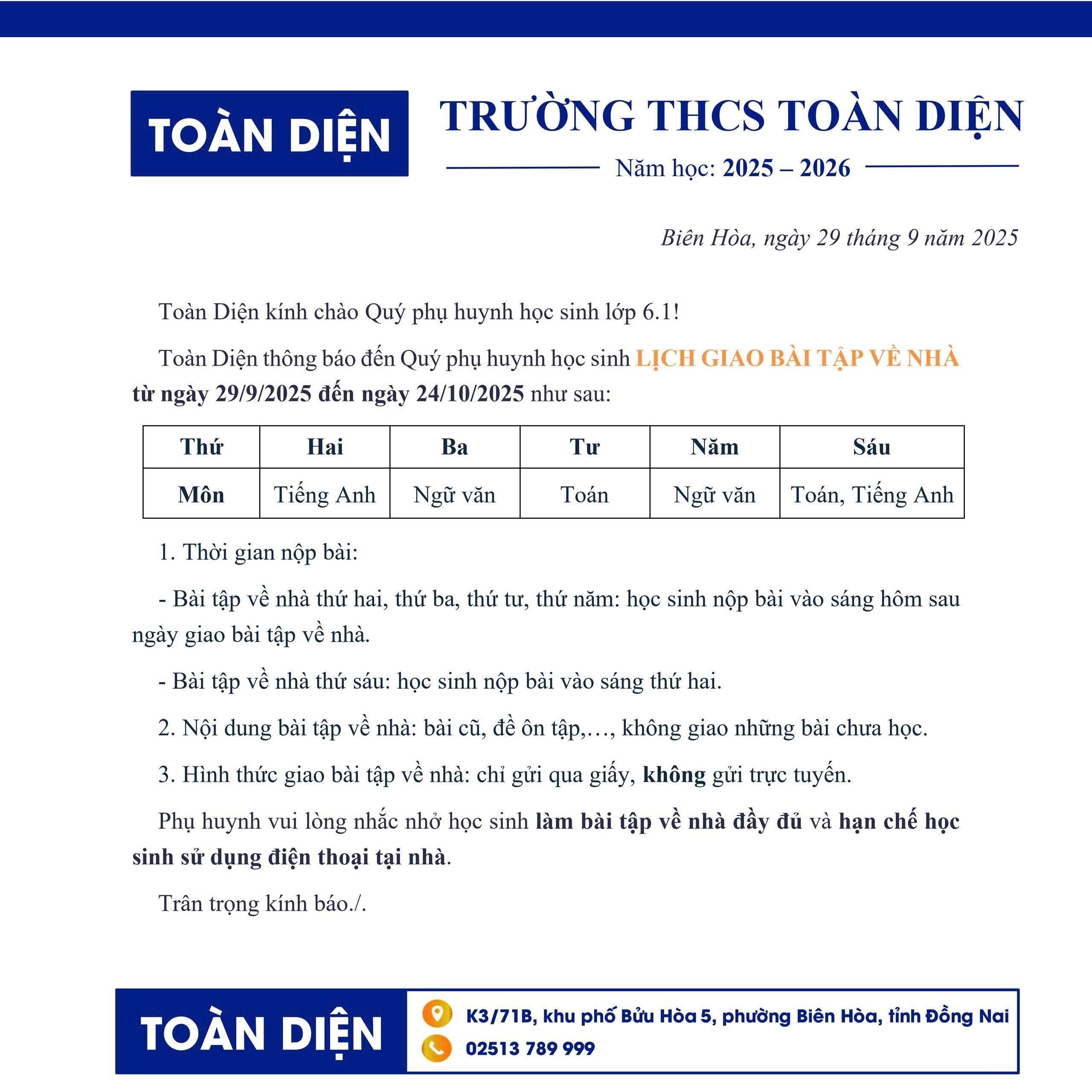 Mỗi ngày, Trường chỉ giao bài tập về nhà 1 trong 3 môn Toán, Ngữ văn, Tiếng Anh nhằm giúp học sinh củng cố kiến thức và nâng cao kỹ năng làm bài.