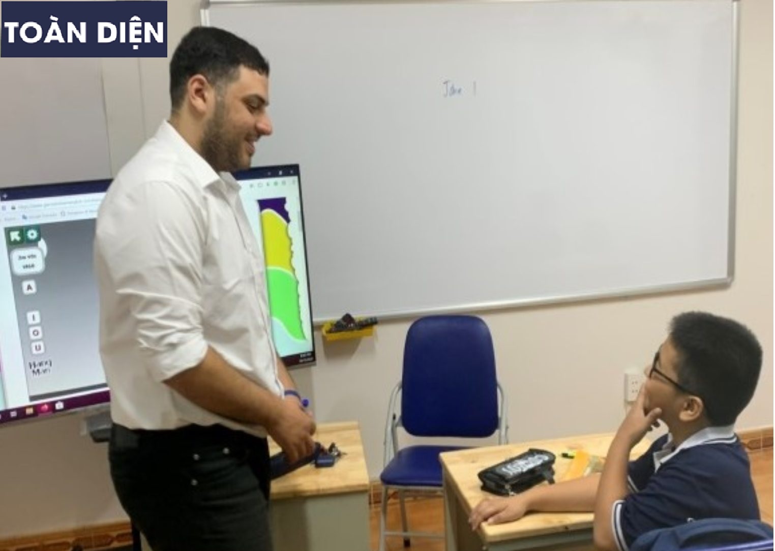Học sinh giao tiếp tiếng Anh với giáo viên nước ngoài.